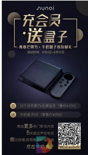 7月31日发布会当天芒果TV即在站内开启了牛奶盒子的预售活动,昨日牛奶盒子产品也正式进入首发阶段。官方更是推出了“买会员送盒子”的优惠活动。8月4日起,用户仅需购买一张价值330元的芒果TV全屏会员年卡,便可享受原价388的牛奶盒子+会员卡套餐,目前首发活动正在芒果TV站内火热进行。