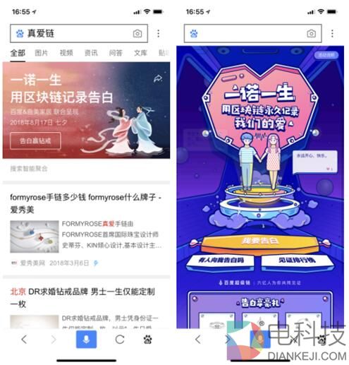 想要参与活动的用户,只需要在8月12日14:00到8月24日14:00,用百度搜索“真爱链”,就能在搜索结果中看到“一诺一生,用区块链记录告白”的活动界面,点击“告白赢钻戒”即可参加活动,百度搜索为“见证排行榜”前100名的用户准备了包括钻戒、饰品、手链等在内的告白助威礼。