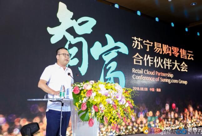 (图为美的集团国内市场运营总经理王新亮在苏宁易购零售云合作伙伴大会上发言。)