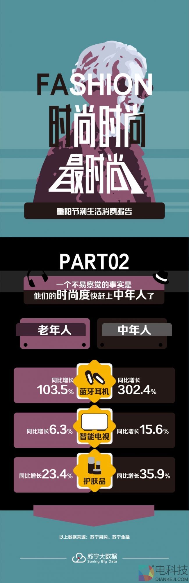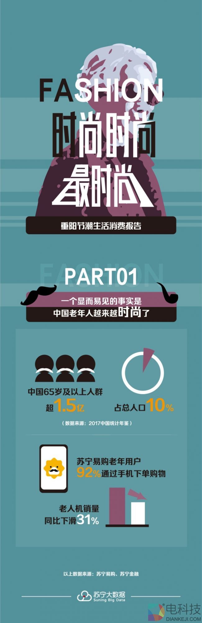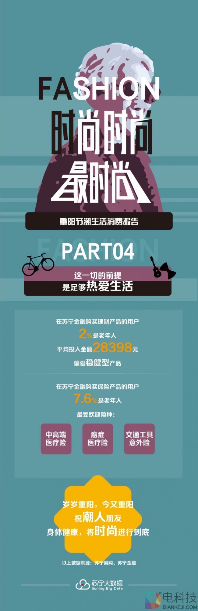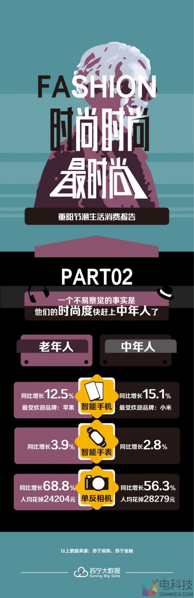 重阳节到来之际,苏宁易购和苏宁金融联合发布了重阳“潮生活”消费报告。报告显示,当下老年人的生活方式颠覆了传统认知,他们购买智能手机、智能手表、单反相机的热情已经接近甚至超过了45岁至60岁中年群体。