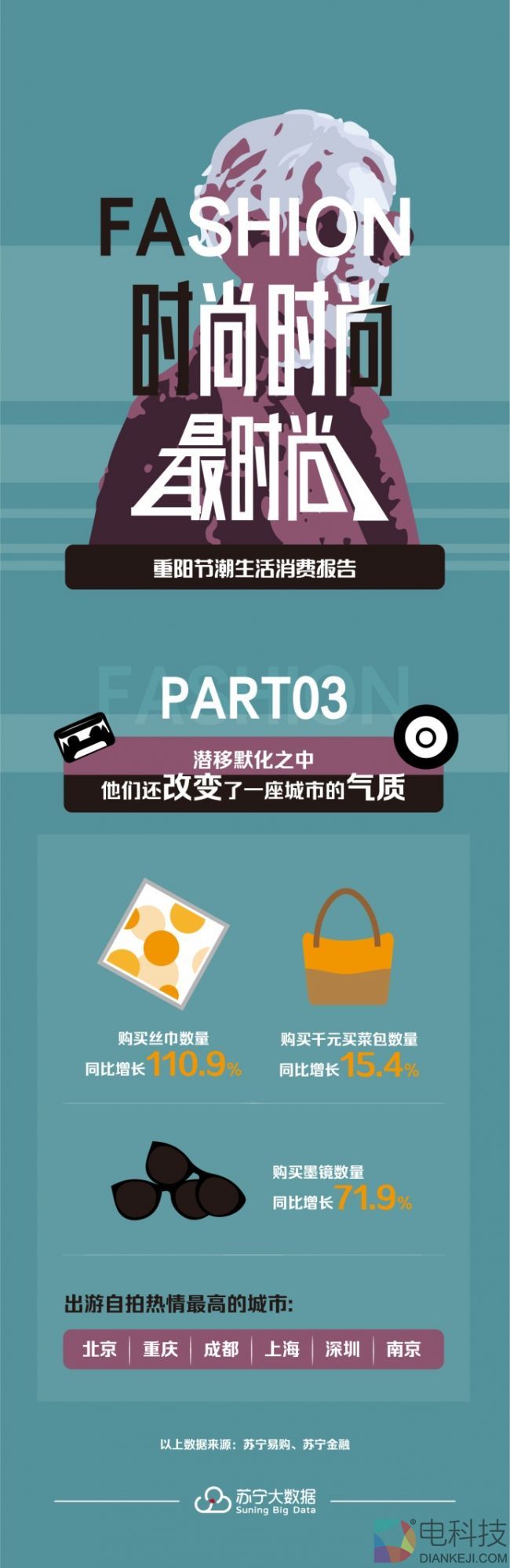 近些年来,老年群体出游的热情越来越高,包包丝巾配墨镜成了不少人拍照留念的标配。苏宁易购数据显示,今年以来,老年人购买的丝巾数量同比增长110.9%,购买的墨镜数量同比增长71.9%,购买1000元至2000元价位包包的数量同比增长15.4%,北京、重庆、成都、上海、深圳、南京这6座城市的老年人,出游自拍的热情最高。