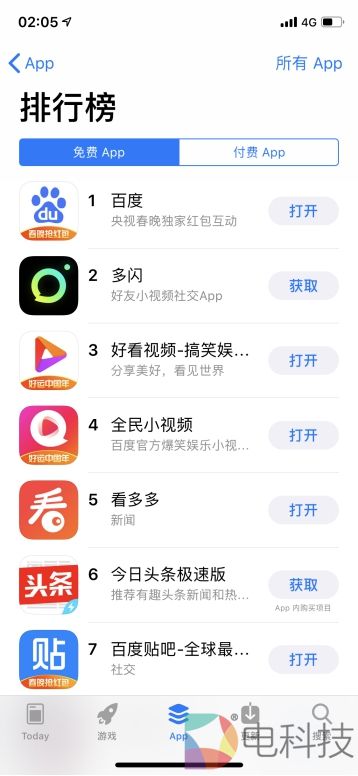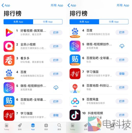 这一“霸榜”的表现跟2月4日除夕夜春晚直播过后的AppStore类似,当时凭借央视春晚的巨大影响力,百度旗下以百度App为首的多款产品都在苹果AppStore免费榜上排名靠前。其中在前5名中有4个是百度系产品App,分别是百度App、好看视频、全民小视频以及看多多,同时百度贴吧也冲进了该榜单的前10名。