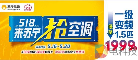 具体到此次“518抢空调”活动,苏宁推出了万套999元爆款产品,低至1999元的一级能效1.5匹变频空调,低于行业价格40%。在预售期内,消费者交10元定金就可获得500元空调套券,此外还有毛巾和空调被等实用礼品相赠,诚意十足。