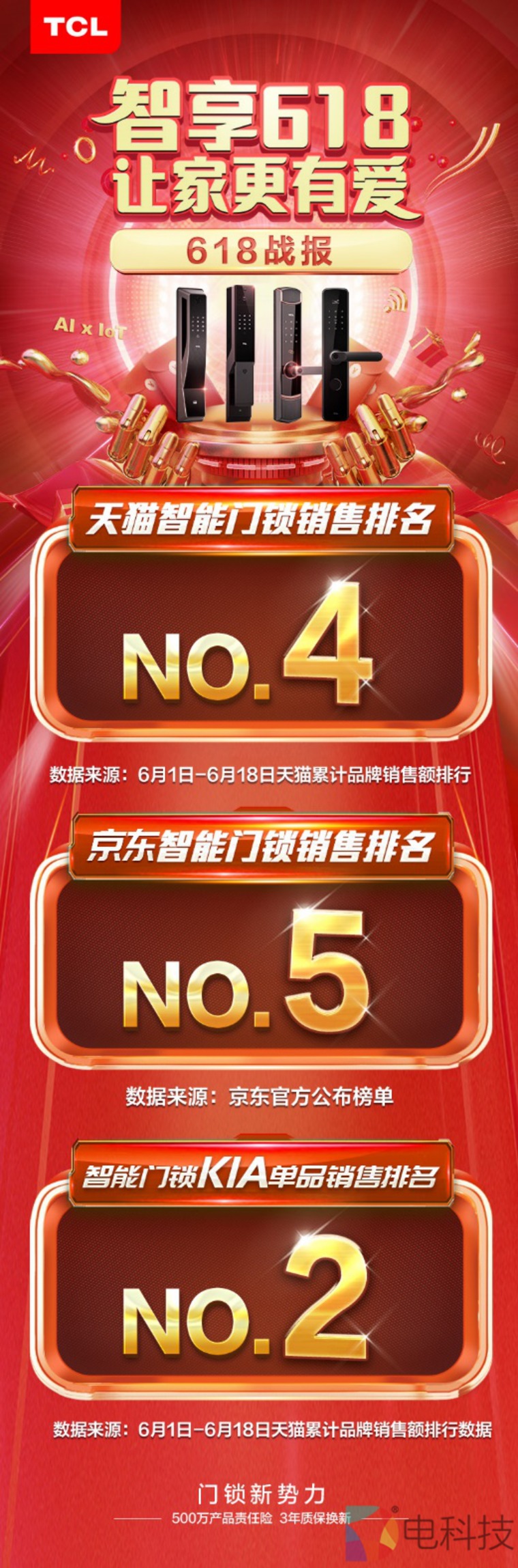 在今年的618年中大促活动期间,智能锁产品异军突起,成为各大平台销售额增长的主力军。其中,TCL物联网智能门锁销售额更是势如破竹,分别夺得了门锁K1A单品销售排名第2名,以及天猫和京东智能门锁销售排名第4名与第5名的亮眼成绩。
