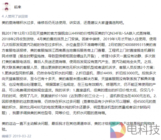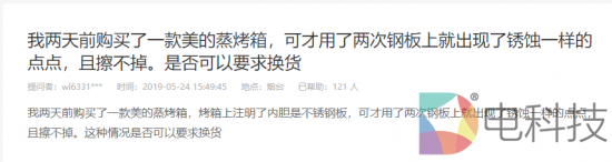 除此之外,美的蒸箱蒸烤箱的用料也让人震惊,有网友表示刚买的产品用了两次就出现锈点。