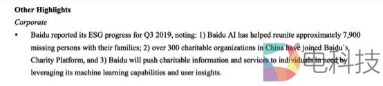 11月7日,百度(Nasdaq:BIDU)公布了2019年第三季度未经审计的财务报告。财报显示,百度实现营收281亿元人民币,归属百度的净利润达到44亿元人民币,远超华尔街预期。不同寻常的是,这份财报提及百度在公益领域的表现,其中百度AI寻人数据值得外界关注。