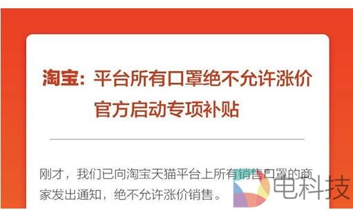 随着新型冠状病毒感染的肺炎疫情的不断演进,作为个人重要防护设备的口罩开始在各大电商平台呈供不应求之势。对于此现象,1月22日上午,淘宝称已向淘宝天猫平台上所有销售口罩的商家发出通知,绝不允许涨价销售。淘宝表示,目前淘宝天猫平台货源充足,同时,淘宝已对聚划算百亿补贴的口罩产品进行了专项官方补贴,未来几周阿里健康“急送药”服务春节不停歇。