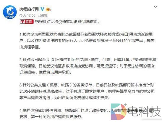 1月21日,携程方面宣布,被确诊为新型冠状病毒肺炎或因疑似新型冠状肺炎被机场(港口)隔离劝返的用户,以及作为密切接触者的同行人,可免费取消携程平台预订的全部产品,损失由携程承担。除此以外,春节期间武汉地区酒店、门票、用车订单,携程提供免费取消保障。对于无法协调的酒店订单损失,携程将为用户承担。