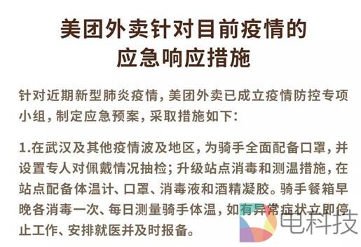 外卖骑手作为城市中的重要运输力量,无疑也需要被重点关注。另外,针对野味产品,外卖平台目前也都开始了全面的自查和下架。1月22日,美团外卖通过官方微博发布消息称,针对近期新型肺炎疫情,美团外卖已成立疫情防控专项小组,制定应急预案。在武汉及其他疫情波及地区,为骑手全面配备口罩,并设置专人对佩戴情况抽检;升级站点消毒和测温措施,在站点配备体温计、口罩、消毒液和酒精凝胶。骑手餐箱早晚各消毒一次。全面排查平台上的野味产品,下线相关商品和商户。