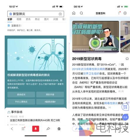 因此,作为国民获取疫情相关信息和知识的最大入口,百度首先把重心放在了关键搜索结果页的内容建设上。因为当社交平台上的各种谣言扩散,大家尤其需要搜索提供更加权威、及时的信息。从“新型肺炎”等关键词的搜索结果页来看,百度第一时间聚合了各方权威信息,包括“新型冠状病毒感染的肺炎”百科医典词条以及事件脉络等,同时在搜索结果页上进行了“积极防护,保护自己,戴口罩,勤洗手”的提示,让用户积极理性防护。这对于疫情中的网民无疑是非常大的价值。