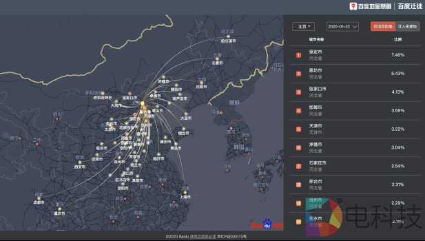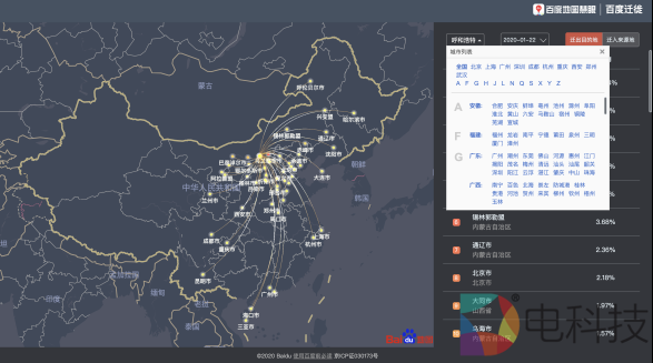 近日,百度地图慧眼升级"百度迁徙"平台(https://qianxi.baidu.com/),基于自身在时空大数据、地理信息处理以及人工智能多方面的技术优势,将复杂的城市人口迁徙数据