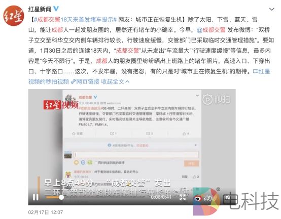 除北京等一线城市出现了因企业有序复工,而产生的短时拥堵之外,成都等“新一线城市”也出现了车流量回升、拥堵再现的情况。2月17日星期一,成都交警时隔18天,首发堵车提示。天府大道、人南立交、双桥子等热门线路正逐渐恢复“生机”。