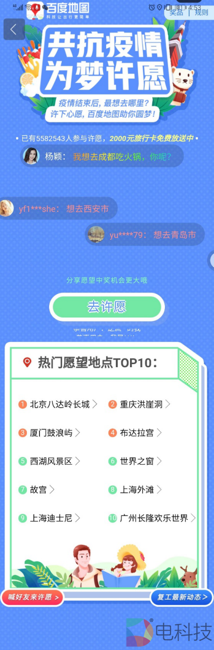 同时,活动页面中还以“许愿弹幕”形式,随机匿名展示大家的心愿目的地。百度地图还邀请杨颖(Angelababy)分享出行愿望,并在弹幕中和大家的愿望一起展示出来,共同期盼着战胜疫情之后的美好旅程。