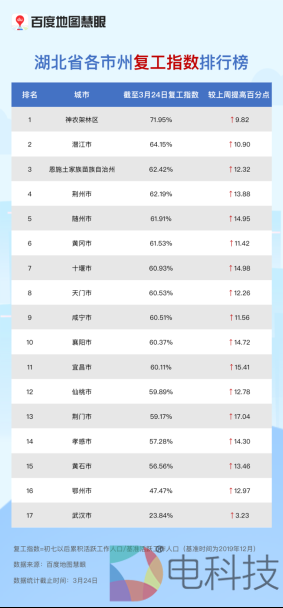 据百度地图慧眼本周最新复工指数显示,截至3月24日,湖北省除武汉市外其余市州复工指数均接近或高于50%,整体较上周明显提升。其中,不仅十堰市、随州市等距武汉市较远的市州复工指数高,紧邻武汉市的黄冈市、咸宁市,复工指数也都达到60%以上。而在周边兄弟市州陆续复工复产之后,武汉市也启动了相关工作,部分汽车、建筑、科技企业已有序复工。数据显示,武汉市最新复工指数达到23.84%,较上周提高3.23%。