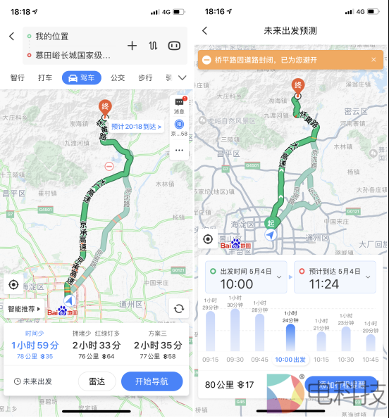 疫情防控背景下,自驾游成了较为安全的出行方式之一。节前北京刚宣布下调疫情防控等级后,多家在线旅游平台的“租车自驾游”搜索量就直线蹿升。但开车出行的人多了,堵车也就难免出现,若担心遇上拥堵,就需要“未来出行”功能“助阵”,选择一个更合理的出发时间。在百度地图驾车导航页面输入出发地后,可以看到左下角的“未来出行”按钮。点击按钮,页面下方会用条形图展现不同出发时刻的用时情况。如果想安排未来几天的行程,还可以切换日期,未来7天内任意时间点出发的路程耗时都可预测。从而帮用户选择最佳出发时段,减少浪费在路上的时间。