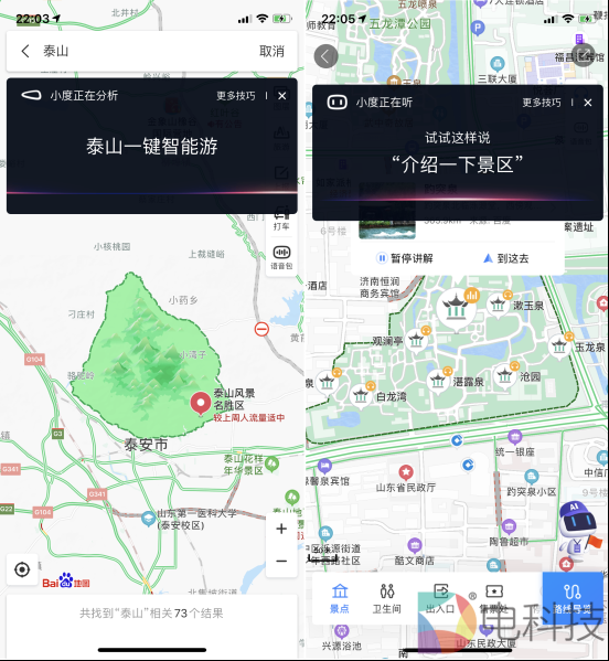 作为旅途中的“贴心伴侣”,百度地图中的小度AI导游已经覆盖了国内全部5A景区。到达景区后,可以借助AI导游get“无接触式”的旅游体验。例如身处泰山时,打开百度地图说出“泰山一键智能游”,将随即跳转到一键智能游页面。接下来还能通过语音方式让智能语音助手来导览路线。“介绍一下景区”指令发出后,语音助手就会带来景区的详细讲解。在页面右下方的AI导游将随着用户实时位置介绍景点。通过智能语音助手找卫生间、停车场、餐厅等都十分方便,省去了找人问路的环节,降低感染风险。