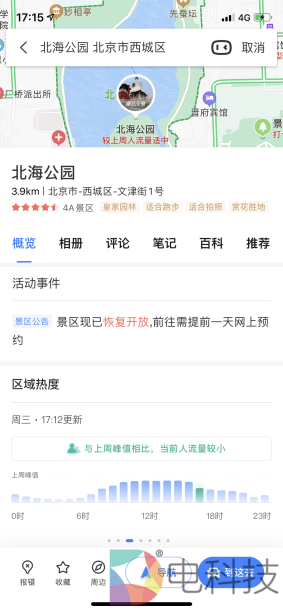 这个五一,“预约旅游”成了关键词之一。特别是除了各大景区之外,不少公园也加入了预约行列。如果担心白跑一趟,出发前可以先在百度地图搜索目的地,详情页面中会写明是否需要预约。同时,还会展示该地当前人流量及未来各时段的人流量预测,方便大众合理安排出行时段。