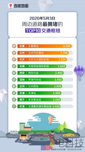 百度地图大数据显示,截至5月3日20:00,全国各地交通枢纽周边道路拥堵指数整体呈下降趋势。周边道路拥堵指数排名前十位的交通枢纽依次为:长春南站、兰州汽车南站、北京大兴国际机场、无锡苏南硕放国际机场、西安北站、深圳罗湖汽车站、兰州西站、天津站、南宁安吉客运站、天津交通集团通莎客运站。其中长春南站周边道路拥堵指数达假期三日来最高值,夏航季开启后的北京大兴国际机场一跃成为交通枢纽拥堵指数top3;苏南硕放国际机场周边道路拥堵指数也有所提高。相较于5月2日,假期第三日交通枢纽周边道路的拥堵指数再创新高。