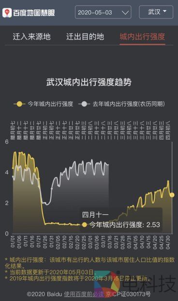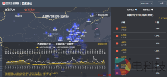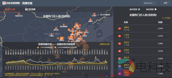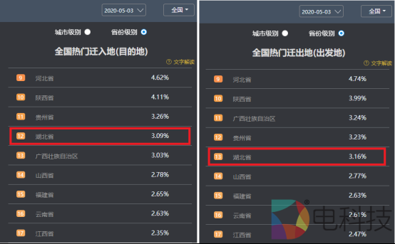 从省份来看,当日广东省的人口迁入迁出比例仍位居全国各省首位,迁入比例榜的第二名和第三名分别是江苏省和山东省;迁出方面,四川省超越山东省跻身热门迁出城市top3。当日湖北省的迁入和迁出比例分别为3.09%和3.16%,较昨日继续上升,疫情防控成效显著。