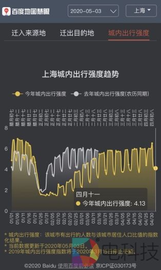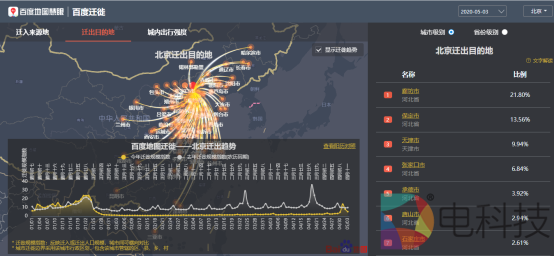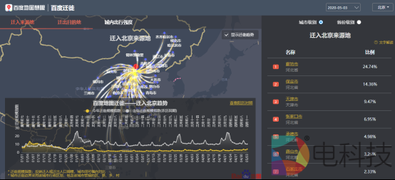 从迁徙大数据平台呈现的北京相关数据来看,5月3日北京市迁入来源地和迁出目的地的城市多隶属河北、天津等周边省份,其中廊坊市以24.74%和21.80%的比例分别位列迁入北京来源地首位和北京迁出目的地首位。可见,北京市民就近旅行的趋势仍旧如火如荼。此外,北上广深等重点城市的城内出行强度也基本恢复至春节前水平,较高的出行热情也体现出了城市正常秩序的恢复。
