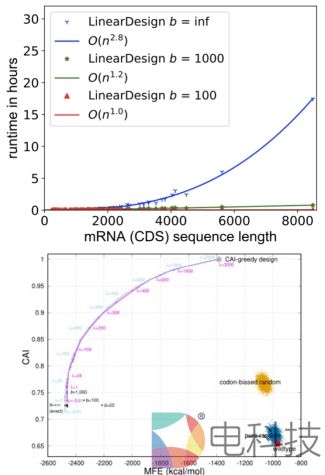 新算法LinearDesign是基于1月底百度研究院对外开放的线性时间算法LinearFold升级。LinearFold预测RNA二级结构的速度堪称全球最快,整个分析时间能够从55分钟缩短至27秒,提速120倍。