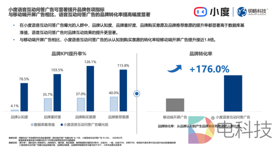 不仅如此,作为可直接实现电商后链路转化的终端,小度具备极大潜力。在小度语音互动问答广告曝光人群中,在观看广告后有后续行为的用户比例显著高于移动端开屏广告。进行过语音互动的用户,去电商网站查询产品信息的提升幅度超过180%。