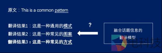 此外,传统的翻译模型一般仅针对当前的输入内容进行翻译,由于缺乏全局信息导致翻译不准确。例如,下面的例子中,在不同的话题下,单词有不同的释义。针对这一问题,提出了融合全局话题信息的翻译模型,进一步提升了翻译准确率。