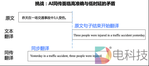 一直以来,如何平衡时延与准确度都是同声传译的难点问题。如下图所示,传统的文本翻译等待原文输入结束后才进行翻译,无法满足同传高实时性要求。要降低时间延迟,就需要对演讲者的内容“同步”翻译,但这样由于缺乏完整的上下文语义信息,会导致翻译出错。