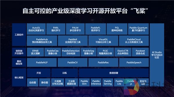 而在芯片之上,深度学习框架上承应用,下接芯片,可以说是“智能时代的操作系统”。百度研制的中国首个开源开放、功能完备、完全自主可控的产业级深度学习平台飞桨,拥有开发便捷的深度学习框架,支持千亿特征、万亿参数的超大规模深度学习模型训练技术,多端多平台部署的推理引擎和产业级开源模型库等四大领先技术。