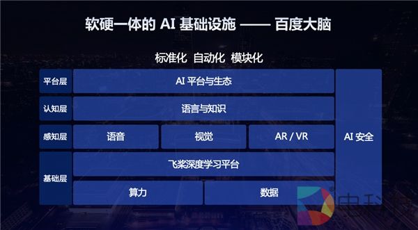 百度作为国内投入最早、技术最强、布局最完整的人工智能领军企业,既是AI基础设施的建设者,也是AI技术及应用创新的引领者和推动者,百度大脑即是百度打造的软硬一体的AI基础设施。其基础层包括算力、数据技术,以及以飞桨深度学习平台为核心的算法平台,感知层包括语音、视觉、AR/VR等技术,认知层是语言与知识技术。同时,还拥有纵贯各层完整的安全体系,以及面向开发者和合作伙伴的AI平台与生态。