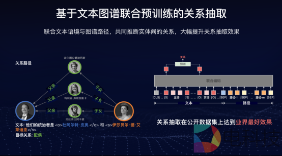 在关系抽取技术上,提出了基于文本图谱联合预训练的关系抽取,通过联合文本语境与图谱路径,共同推断实体间的语义关系,从而大幅提升关系抽取效果。目前,关系抽取在公开数据集上达到了业界最好的效果。