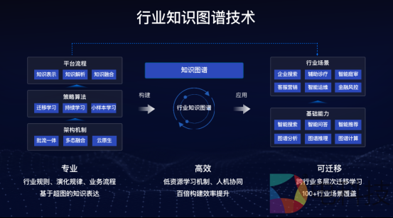 据朱勇介绍,这整套完整的行业知识图谱的技术体系有三个主要的特点:第一,专业性强,行业知识图谱技术面向行业内的专业复杂知识,实现了基于超图的知识表达;第二,构建效率高,支持低资源的学习机制,人机协同的图谱构建相对于传统的人工构建方法,效率提升百倍以上;第三,具有很强的可迁移性,实现了从通用到行业,以及跨行业的多层次迁移学习,目前已经覆盖了100多个行业的应用场景。