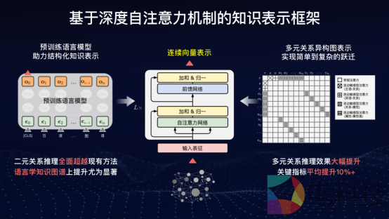 具体而言,在通用图谱方面提出了基于深度自注意力机制的知识表示框架,通过深度自注意力网络对知识图谱中的实体和关系进行连续向量表示,在此基础上,进一步引入预训练语言模型助力结构化知识表示,二元关系推理能力全面超越现有方法,语言学知识图谱上提升尤为显著。此外,利用多元关系异构图表示,实现了简单知识表示到复杂知识表示的跃迁,多元关系推理效果大幅提升,关键指标平均提升10%+。