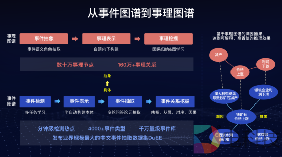 在事件图谱方面,百度已经形成了事件检测、事件表示、事件抽取、事件关系挖掘等核心能力,可实现分钟级检测热点、构建了包含4000多种事件类型、千万量级的事件库,并发布了业界规模最大的中文事件抽取数据集DuEE,助力业界事件抽取技术的发展。百度还研发了事理图谱,包括事件抽象、事理表示、事理挖掘为核心的关键技术,形成了数十万事理节点、160多万的事理关系。在真实的应用场景中,实现了从具体事件到抽象事件的知识的跨越。