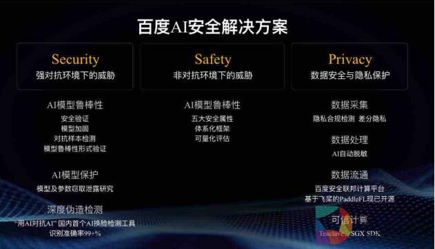 正如本次百度世界大会“万物智能”的主题,作为百度大脑核心架构之一,百度的AI安全能力将持续致力于为AI大生产平台的升级和产业智能化变革保驾护航。并从Security、Safety及Privacy多个维度,打造更安全的AI,打造更安全的AI时代。