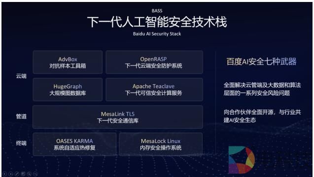 当然,围绕算力、算法、数据的安全研究与解决方案,只是在百度大脑AI安全体系框架下的其中一环。面向更为广泛的AI安全生态挑战,基于全面开源的“七种武器”BASS下一代人工智能安全技术栈等AI安全核心技术,百度正为解决AI生态中云、管、端及大数据和算法层面的一系列安全风险问题提供支持。