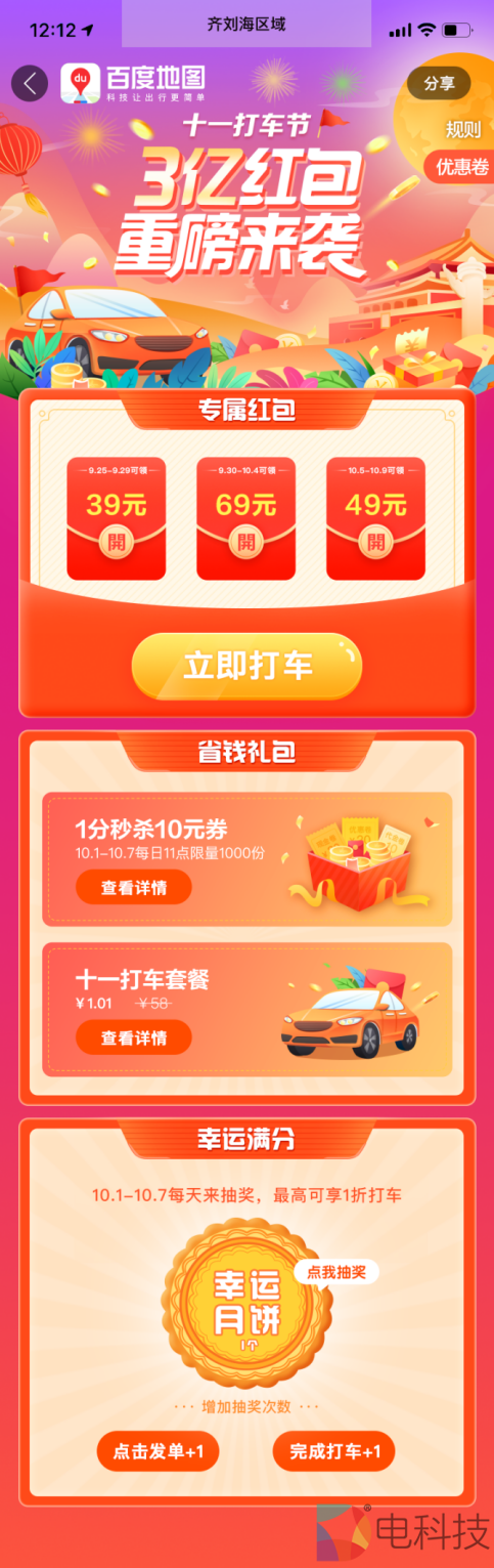 假期正是打车高峰,为让用户出行更省钱,百度地图在9月25日至10月9日期间又推出了“十一打车节”,通过专属红包、省钱礼包和幸运满分三个活动,狂撒3亿打车补贴,让打车福利领个够。用户在百度地图主页搜索“3亿红包”,方可进入活动页面。