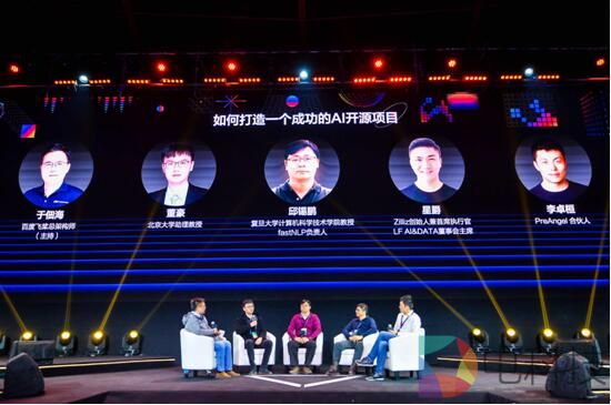 开源共建圆桌论坛环节,百度飞桨总架构师于佃海与北京大学助理教授董豪、PreAngle合伙人李卓桓、复旦大学计算机科学技术学院教授、FastNLP负责人邱锡鹏以及Zilliz创始人兼首席执行官、LF AI&DATA董事会主席星爵等开源领袖就“如何打造一个成功的AI开源项目”展开研讨,共话AI开源发展。