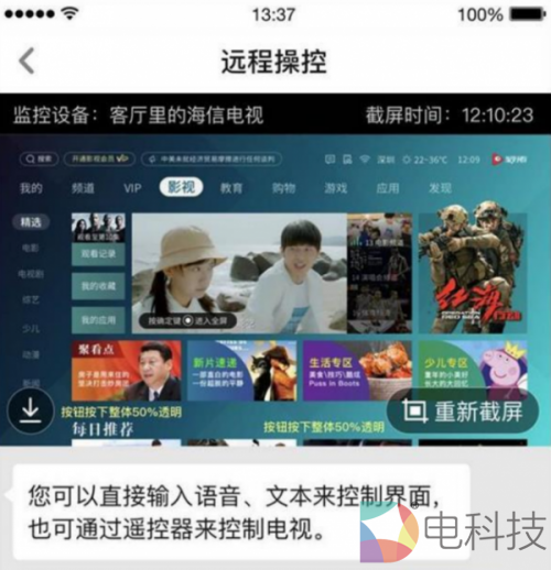 ‘“远程操控的需求其实一直都存在,但行业里一个难题是电视画面难以实时反馈,所以各家都没有上这个功能。 2018年,海信行业内第一个上线全场景图搜交互功能的时候,我们开发了截屏分享功能,也看到电视画面实时反馈的可能。2019年我们在行业内首次实现了远程操控。技术并不复杂,和图搜功能加在一起就起到了1+1>2的奇效。” 海信聚好看家庭娱乐事业部产品部部长高斯太介绍,运用这个功能,不管用户在哪里,掏出手机截屏电视就能和父母长辈面对同一个界面、了解他们正在使用什么功能,分分钟通过手机遥控家里的电视,替他们解决问题。