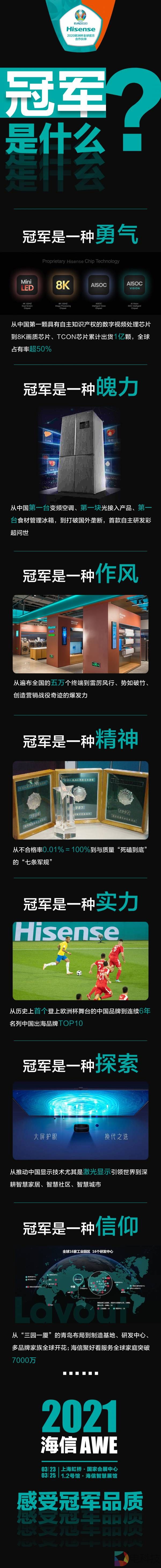 此外,海信还围绕“冠军”的理念,梳理了系统的内容支撑:与质量“死磕到底”的“军纪”、遍布全国的五万个营销终端、领跑全球的7000万家庭用户……