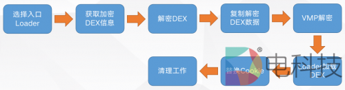 DEX加壳技术:基本原理是对原始的dex文件进行整体加密,隐藏dex文件源码,修改程序入口。运行时通过Dalvik虚拟机动态加载执行解密后的dex文件。具体流程如下:
