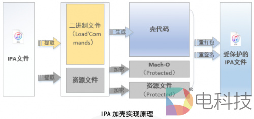 iOS端行程卡的代码保护方案采用的是iPA动态壳保护的模式。整体采用 iPA加固技术,对安装包中的可执行文件进行加壳保护。