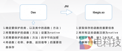 VMP保护技术:与传统的加壳工具不同,不是简单地对目标进行加密、压缩。而是修改目标源码,让目标的部分指令在VMP创建的虚拟环境下运行。首先对原始字节码进行加密处理,然后将函数(方法)替换为native属性,转到JNI层去执行,最后在JNI层将字节码解密,并解释执行。具体流程如下: