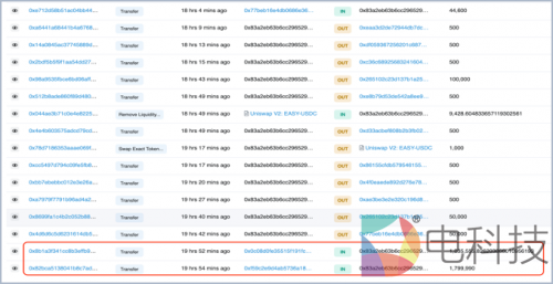 2.该中间地址分别向两个受害者地址(0x0c08d0fe35515f191fc8f0811cadcfc6b2615b74)和(0xf59c2e9d4ab5736a1813738e5aa5c3f5eaf94d9e)发送了2,700,000和2,000,000个 EASY。