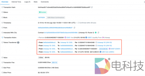 在完成攻击获取到大量EASY数字资产后,该攻击者接着在Uniswap中将EASY置换为USDC。交易的记录如下图所示: