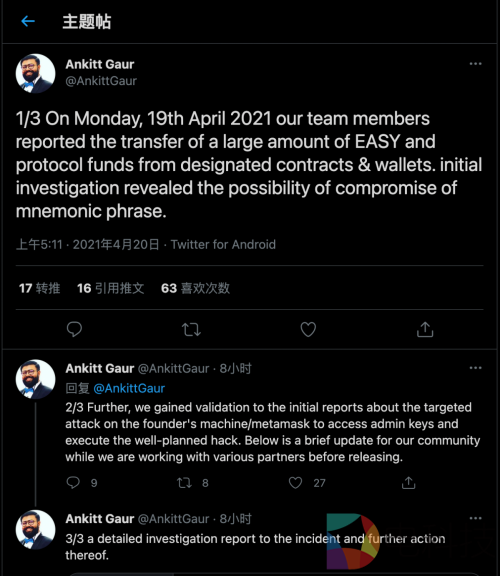 北京时间2021年4月19日,Layer 2 DeFi 借贷协议 EasyFi创始人兼 CEO Ankitt Gaur 称,「有大量 EASY 代币从 EasyFi 官方钱包大量转移到以太坊网络和 Polygon 网络上的几个未知钱包。有人攻击了管理密钥或助记词。黑客成功获取了管理员密钥,并从协议池中以 USD/DAI/USDT 形式转移了 600 万美元的现有流动性资金,并将 298 万枚 EASY 代币(约占 EASY 代币总供应量的 30%,目前价值 4090 万美元)转移到了疑似黑客的钱包(0x83a2EB63B6Cc296529468Afa85DbDe4A469d8B37)中。」