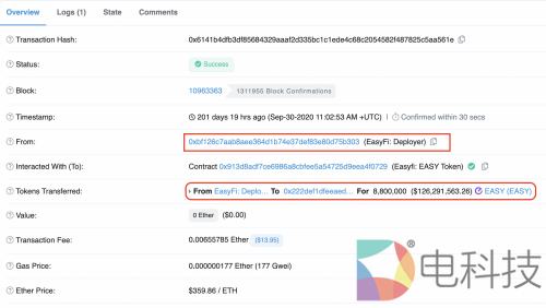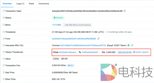 1.最初EasyFi项目的官方向中间地址(0x222def1dfeeaed8202491cdf534e4efff3268666)发送了8,800,000 EASY。