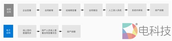 借助电子签约,该企业优化后的生产排期流程为:线上签约,数据同步→排产人员线上查看合同签署状态→生产排期,相比纸质合同的7个流程节点,省去了4个节点,流程更加精简。