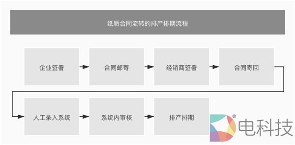 该企业对生产管理与物料采购管理严格,需要销售部门确认销售合同签署成功后,才能开始排产排期。在使用纸质合同时,该企业从销售签约到排产排期的业务流程为:企业签署→合同邮寄→经销商签署→合同寄回→人工录入系统→系统内审核→排产排期。