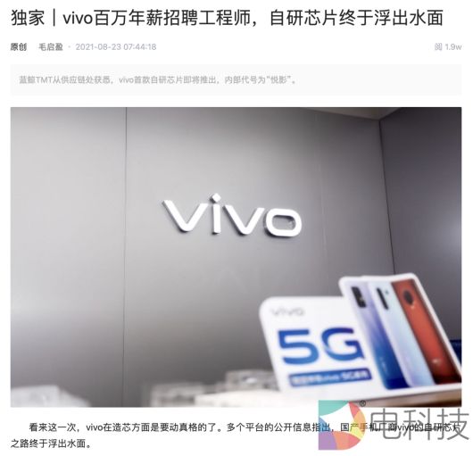 最近几天,“vivo造芯”的各种信息被媒体接连曝光,坊间对于vivo自研芯片的能力与进度也有了一些不同的猜想。从目前爆料的各种信息来看,vivo对芯片制造或许早有布局。早在2019年以前,vivo自研芯片就已经在规划范围内,高薪招聘芯片研发人才、芯片商标注册、建立专门的芯片研发中心……大手笔招兵买马、筹备布局,到逐渐建立起自己的芯片研发团队,再到最终实现量产,vivo一步步展现其在芯片研发领域所具备的实力与决心。